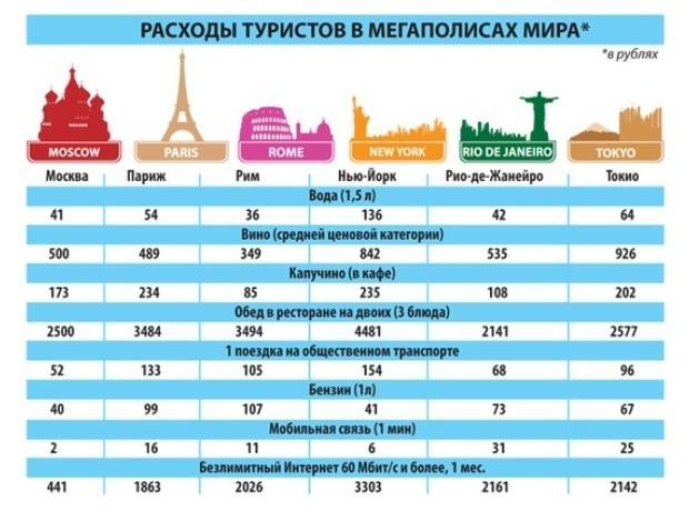 Автор сравнивает расходы туристов в следующих городах мира: Москва, Париж, Рим, Нью-Йорк, Рио-де-Жанейро, Токио.