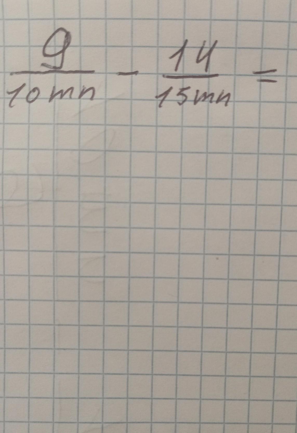 \frac{9}{10mn}-\frac{14}{15mn}=\frac{9}{2*5mn}-\frac{14}{3*5mn}=\frac{9*3-14*2}{2*3*5mn}=\frac{27-28}{30mn}=-\frac{1}{30mn}