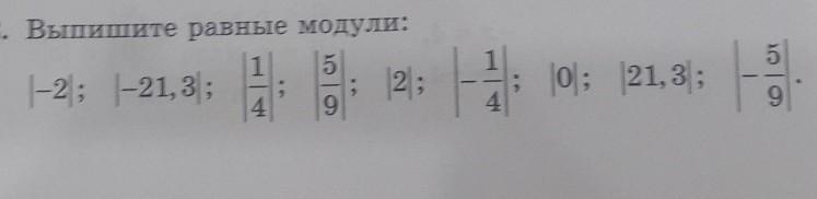 |-2| и |2|; |-21,3| и |21,3|; |-1/4| и |1/4|; |-5/9| и |5/9|.