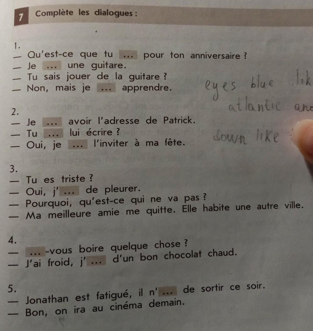 Tu es triste ? Oui, j'ai envie de pleurer. Pourquoi, qu'est-ce qui ne va pas ? Ma meilleure amie me quitte. Elle habitera une autre ville.