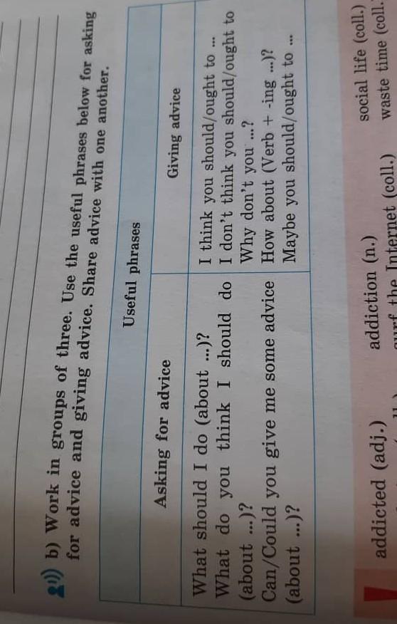 В этом задании нужно работать в группе их трех человек. Используя фразы в табличке задавайте друг другу вопросы, а так же отвечайте на них. Вопросы по типу "Что я должен сделать?" или "Как ты думаешь, что я был должен делать?". А ответы ( советы), например "Я думаю ты должен был...", или "Как насчет того, чтобы сделать...". Если остались вопросы, задавай)