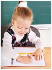 На данной фотографии мы видим девочку. На вид она маленькая, лет ей семь или шесть. Волосы светлые, завязаны в хвостик. Она одета в школьную форму: белая водолазка, клетчатый сарафанчик. На её лице играет улыбка. Видно, что девочка сидит в классе, за учительским столом. В руках она держит ручку и что-то пишет в тетради.