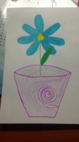 это цветок. у него семь синих лепистков. он стоит в фиолетовом (porpul) горшке.