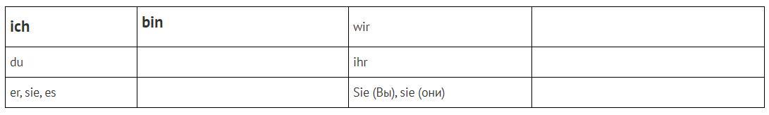 Ergänzen Sie die Tabelle. Необходимо проспрягать глагол "sein" в настоящем времени Präsens.