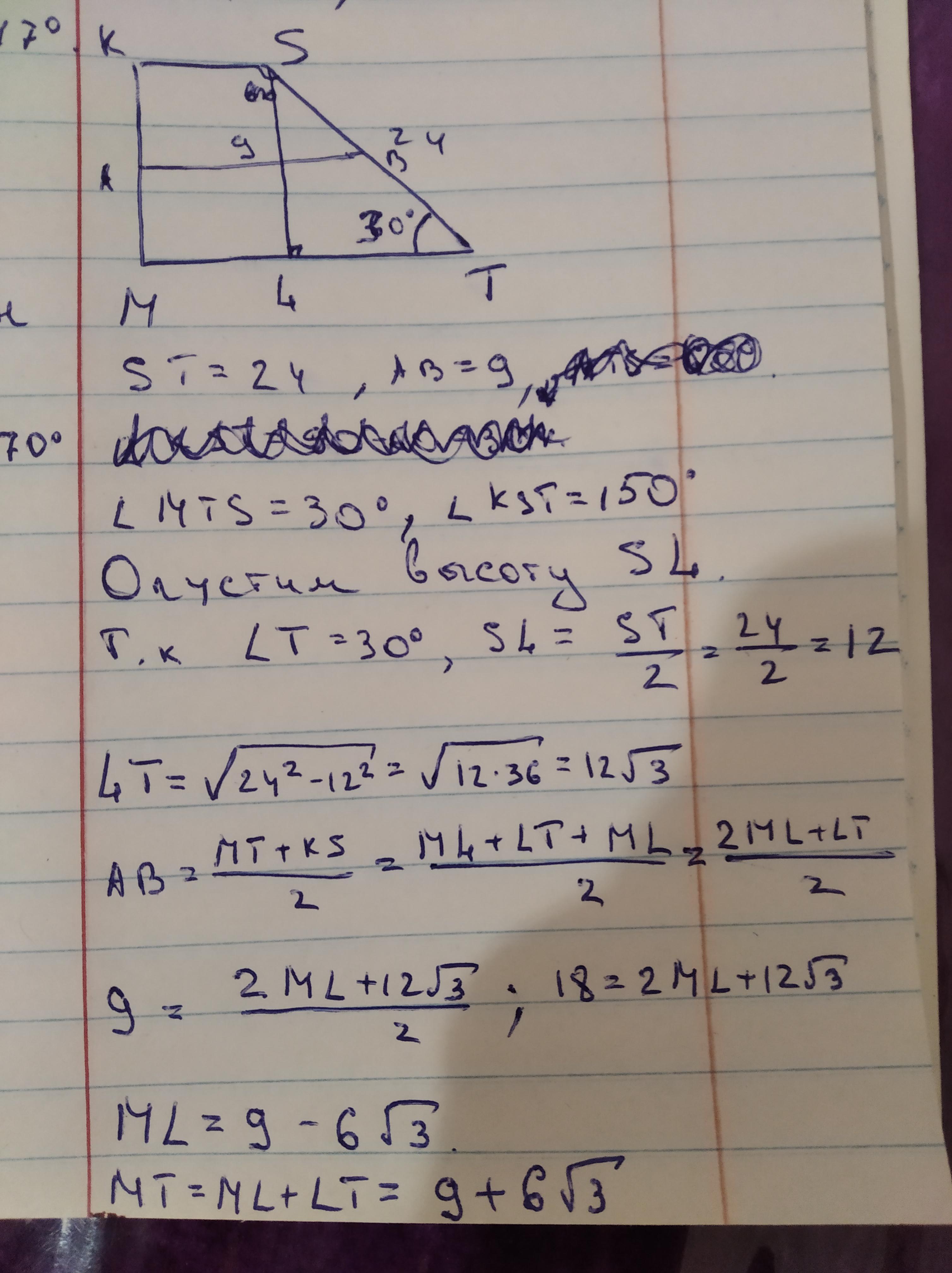Прямоугольная трапеция MKST. Большая боковая сторона равна 24 см. Средняя линия AB = 9 см. Один из углов, равен 60 градусов. Найдите основание трапеции.