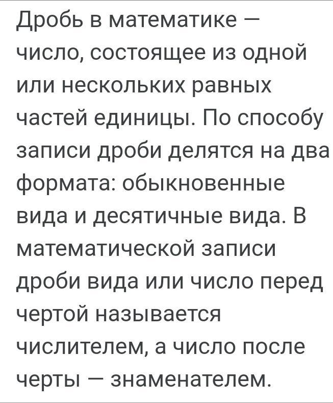 Дробь — это число, составленное из целого числа долей единицы. То есть, когда надо найти дробь от определенной величины, эту величину принимают равной единице. ... Горизонтальная линия между верхним и нижним числами называется дробной чертой (или чертой дроби). Число, стоящее вверху над дробной чертой — числитель дроби. надеюсь помогла )