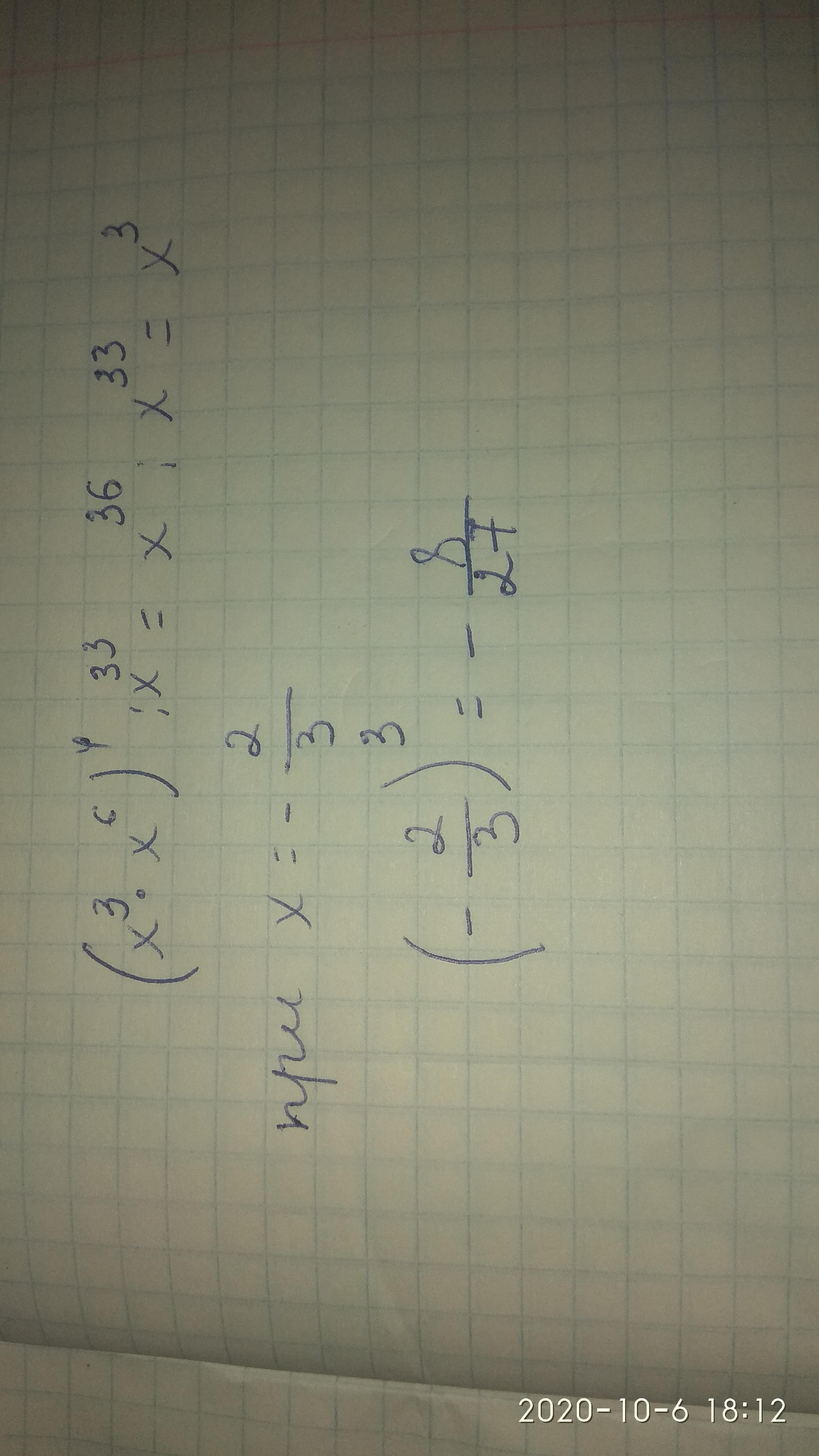 (х³×х⁶)⁴÷х³³ = (x⁹)⁴÷x³³ = x³⁶÷x³³ = x³⁶⁻³³=x³ = (-2/3)³= -8/27