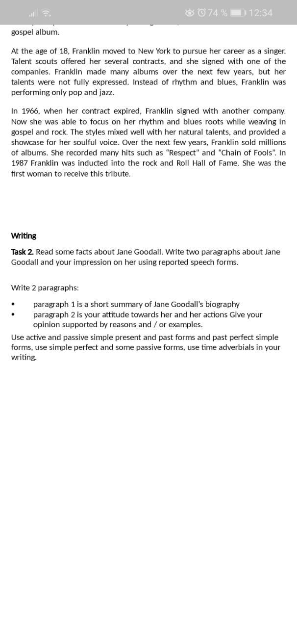 перевод : [Задание 2. Прочтите некоторые факты о Джейн Гудолл. Напишите два абзаца о Джейн Гудолл и своем впечатлении о ней, используя отчетные речевые формы.]