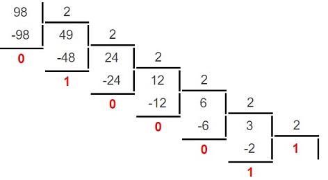 98₁₀ = 1100010₂