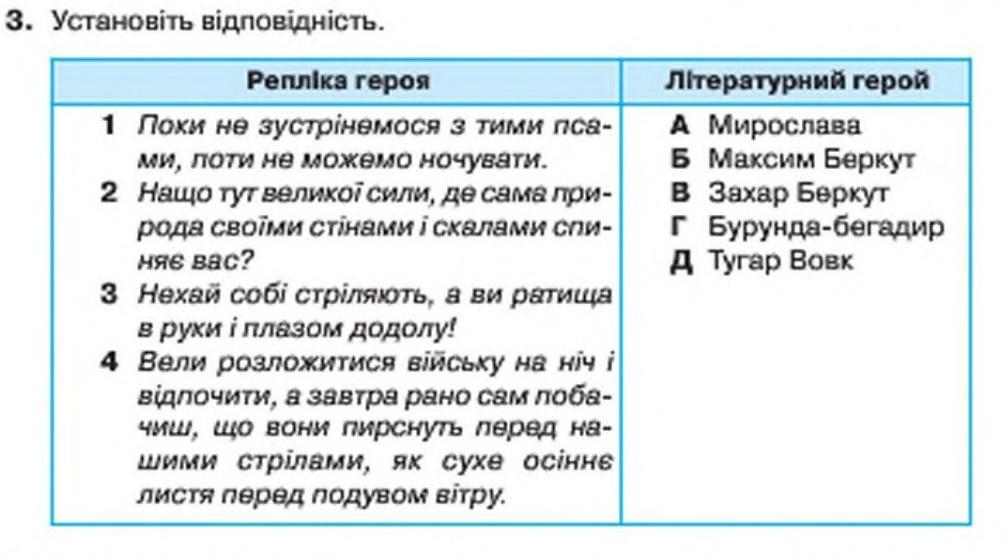 Установіть відповідність між репліками героя і літературним героєм. По повісті "Захар Беркут".