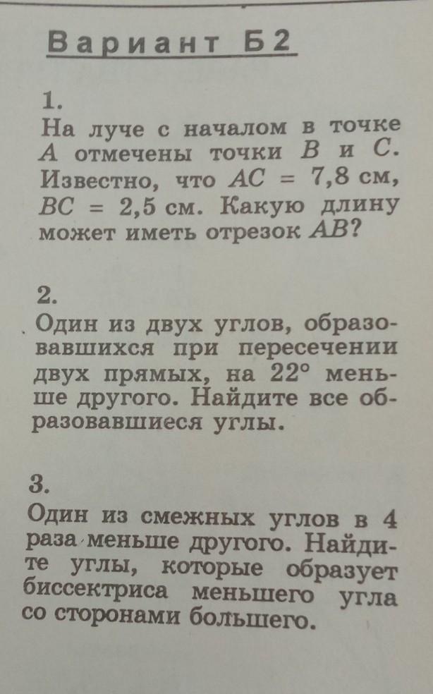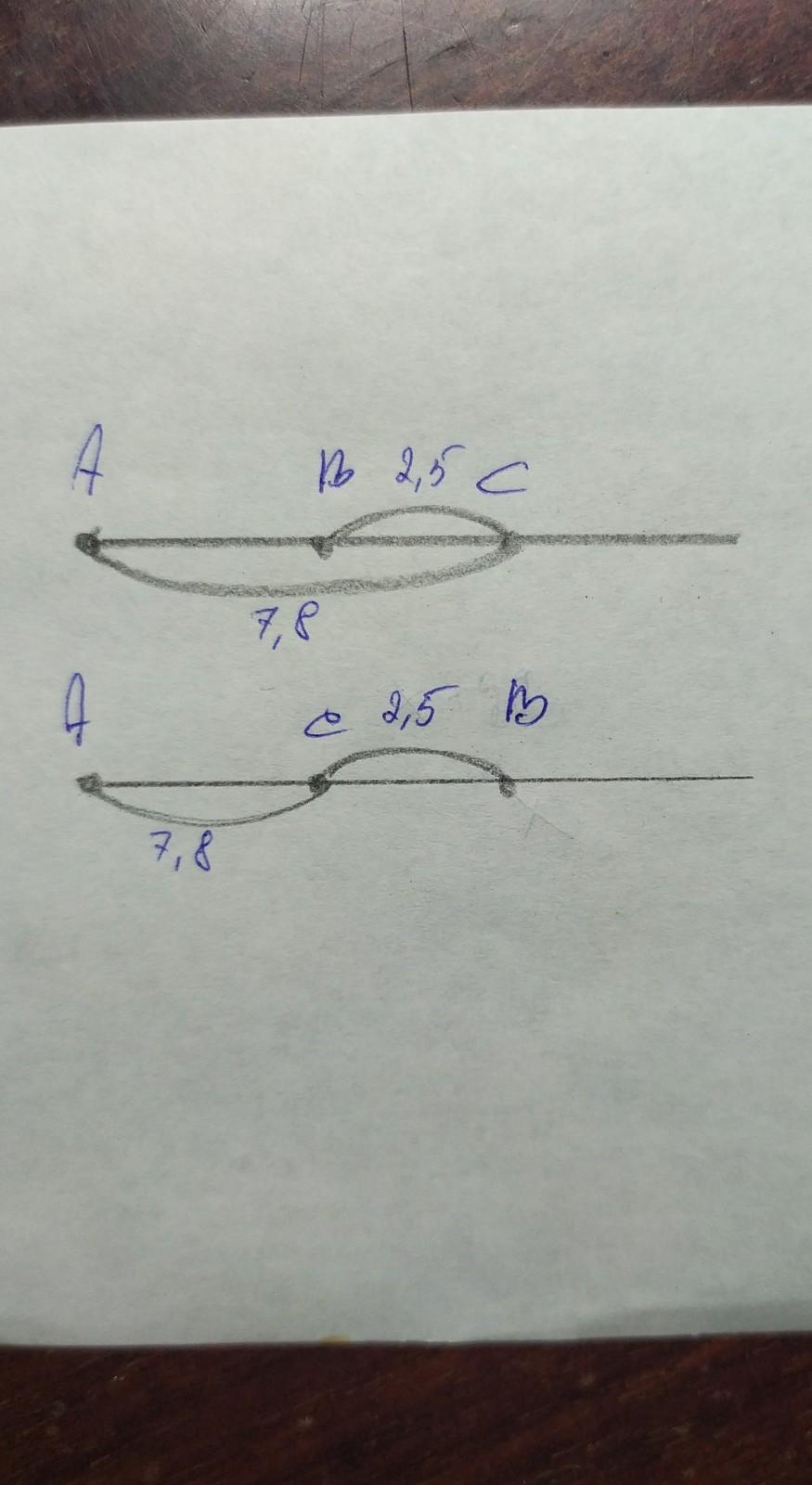 1) если точка С после точки В, то АВ=7,8-2,5=5,3 см или, если точка С перед точкой В, то АВ=7,8+2,5=10,3 см