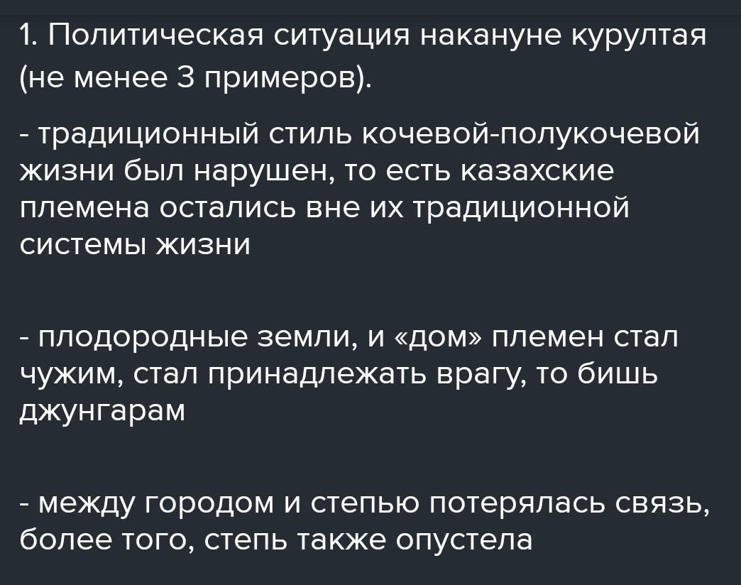 Опишите значение Курултая в Каракум в объединении казахов против джунгар по следующиму плану: 1.Политическая ситуация накануне Курултая (не менее 3 примеров) 2.Влияние Курултая на развитие последующих исторических событий (не менее 2 фактов) 3.Вывод.) помогите пожалуйста
