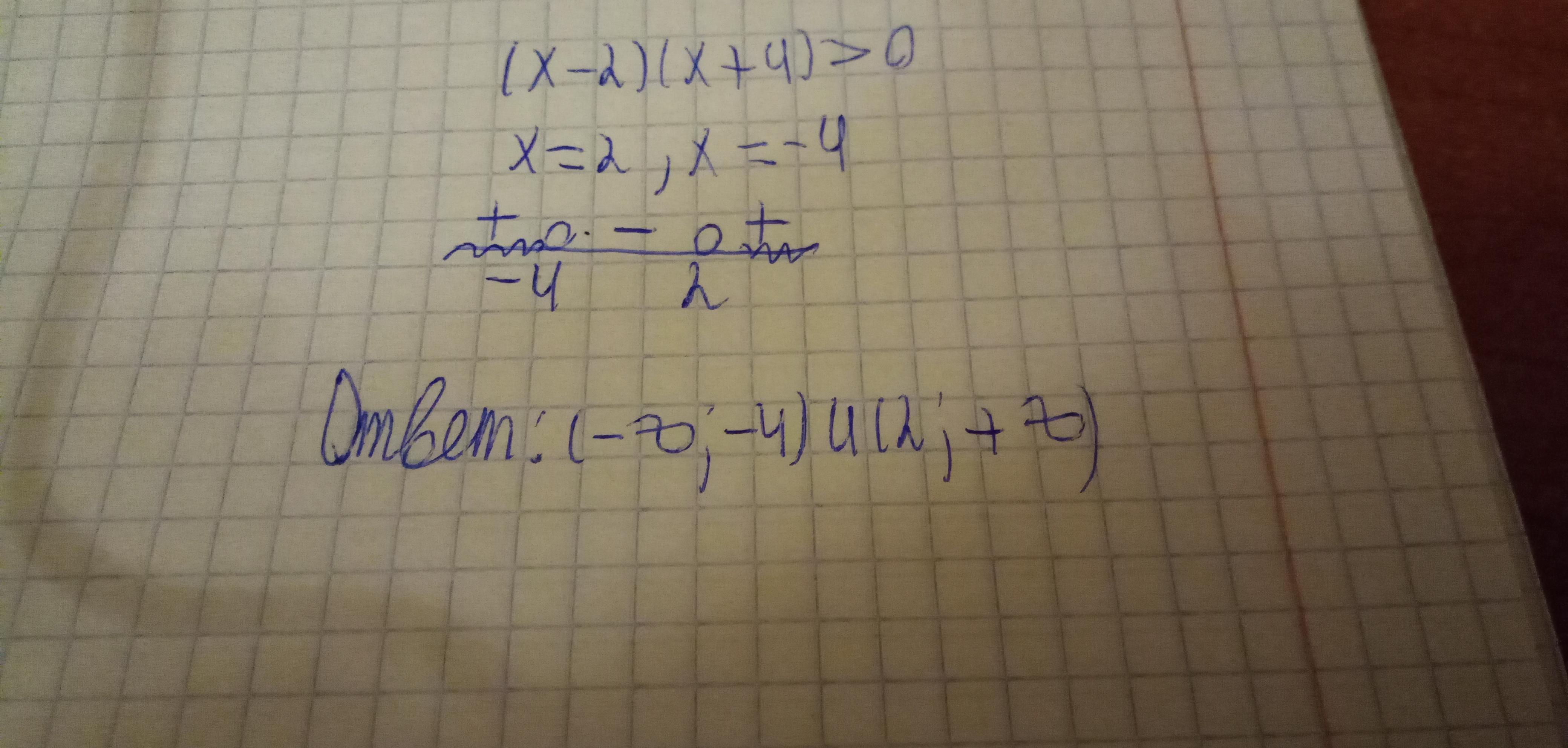 Ответ: оба множителя должны быть одного знака. Когда оба положительны х1-2>0⇒х1>2, x1+4>0⇒x1>-4⇒x1>2