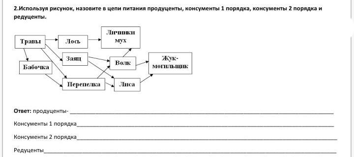 Используя рисунок, назовите в цепи питания продуценты, консументы 1 порядка, консументы 2 порядка, редуценты