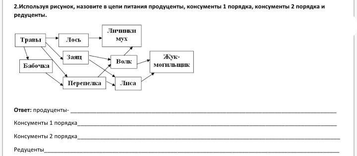 Используя рисунок, назовите в цепи питания продуценты, консументы 1 порядка, консументы 2 порядка, редуценты