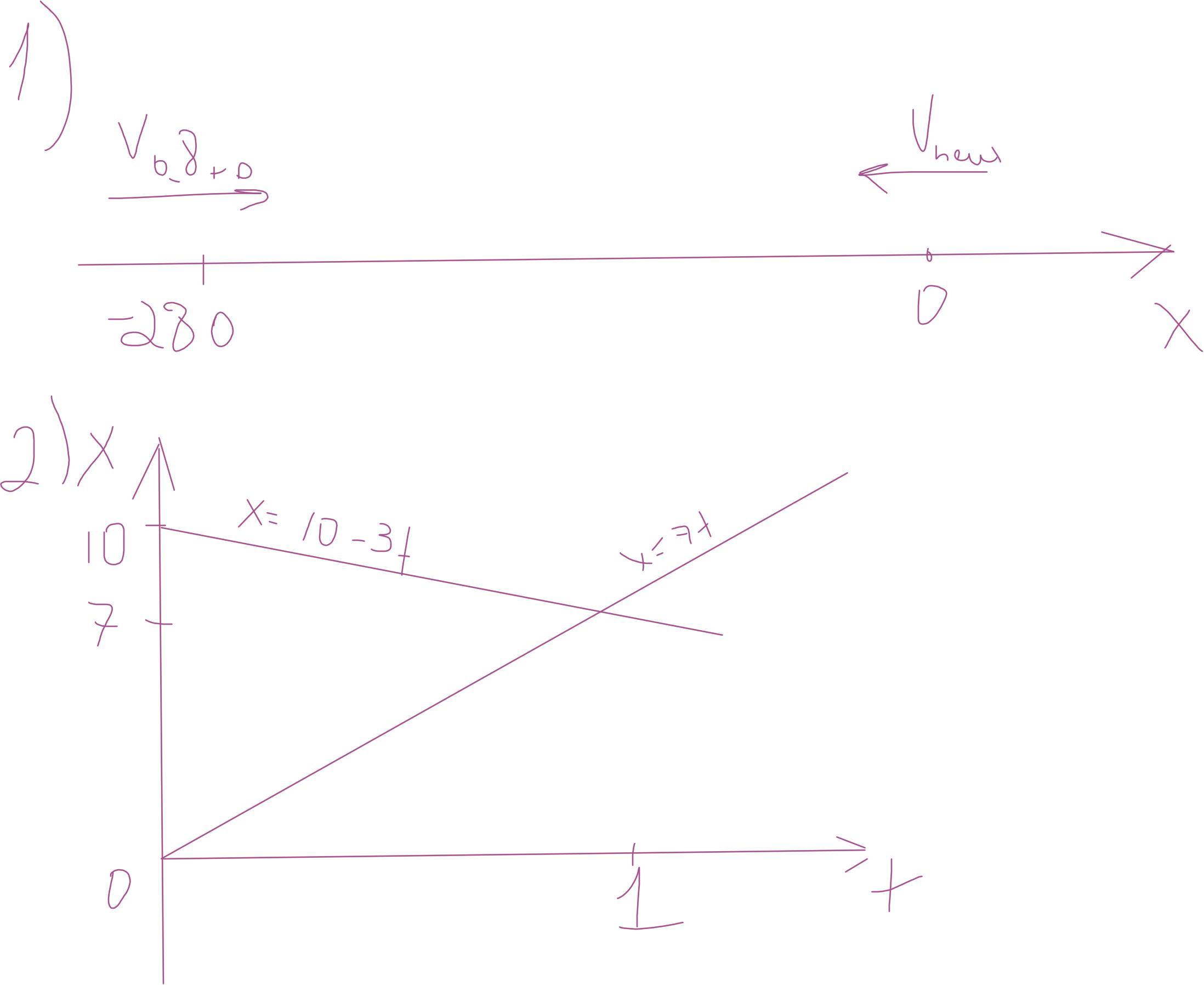 Автомобиль х1= -280 +13t, - 280 начальная координата, а 13 - скорость