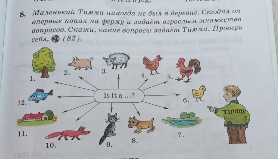 Ответ:1 tree 2 pig 3 sheep 4 chick 5 rooster 6 chicken 7 lake 8 dog 9 cat 10 fox 11 farm 12 fish
