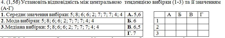 пожалуйста помогите! Установіть відповідність між центральною тенденцією вибірки (1-3) та її значенням (А-Г)