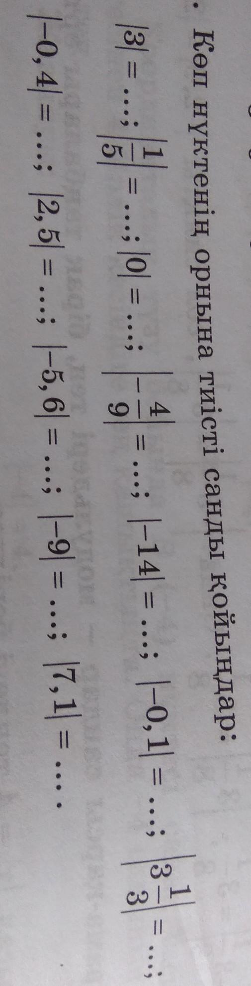 |3|=3, |1/5|= 1/5, |0|=0, |-4/9|=4/9, |-14|=14, |-0,1|=0,1, |3 1/3|=3 1/3, |-0,4|=0,4, |2,5|=2,5, |-5,6|=5,6, |-9|=9, |7,1|=7,1