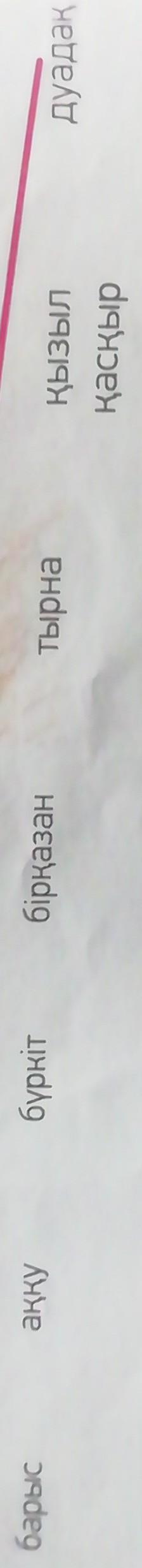 барыс - барс, аққу- лебедь, бүркіт- беркут, бірқазан - пеликан, тырна - журавль, қызыл қасқыр - красный волк, жуадақ - дрофа