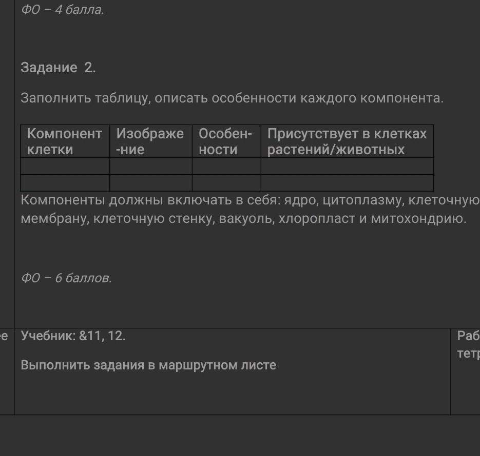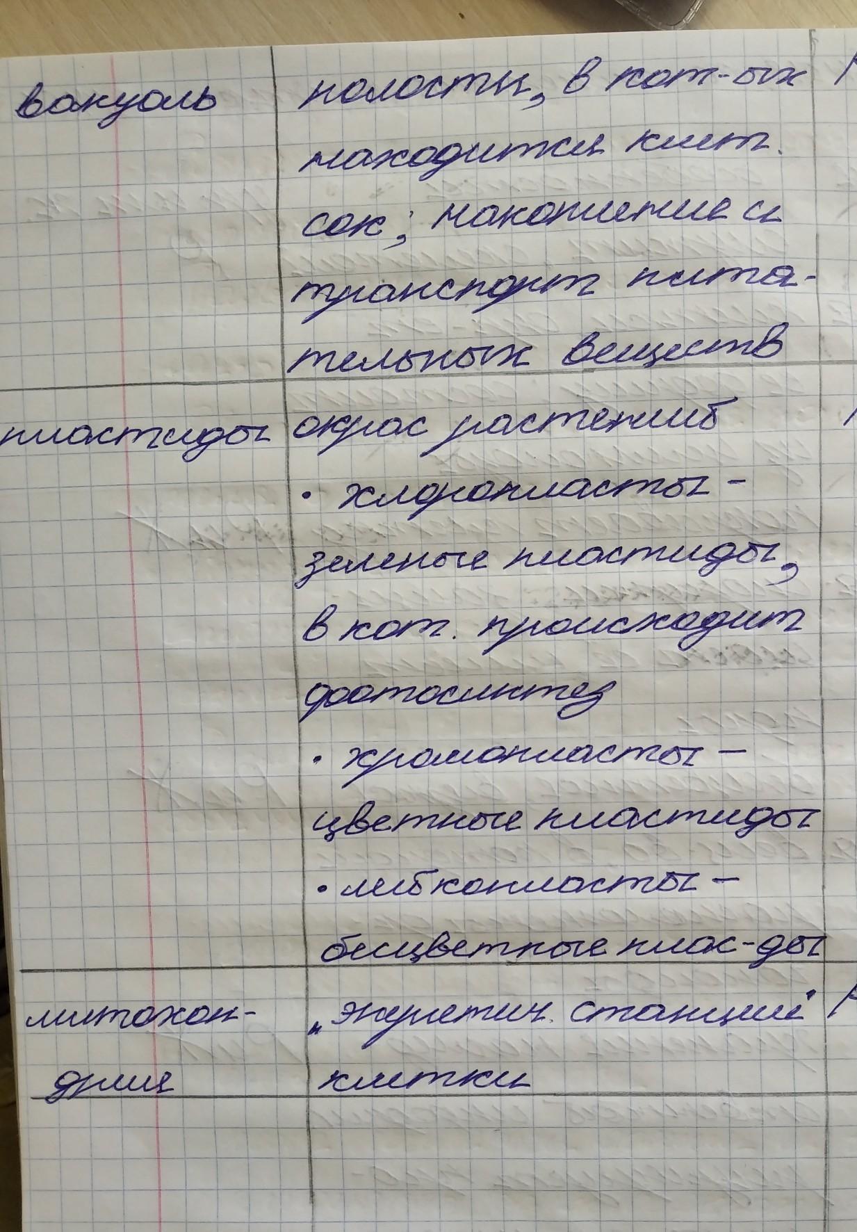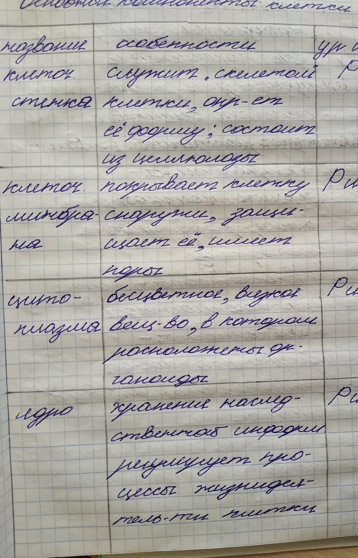 1)клеточная стенка. Особенности: служит скелетом клетки и определяет её форму. Она состоит из целлюлозы 2) клеточная минбрана. особенности: покрывает клетку снаружи и защищает её, имеет поры. 3) цитоплазма . особенности: это бесцветное вязкое вещество, в котором расположены органоиды клетки. 4) ядро. особенности: хранит наследственную информацию и регулирует процессы жизнедеятельности клетки. 5) вакуоль особенности: это полости в которых находится клеточный сок. накапливают и транспортируют питательные вещества. 6) пластиды особенности: это окрас растений. они делятся на: хлоропласты, хромопласты, лейкопласты 7) митохондрии. особенности: служат энергетическими станциями клетки
