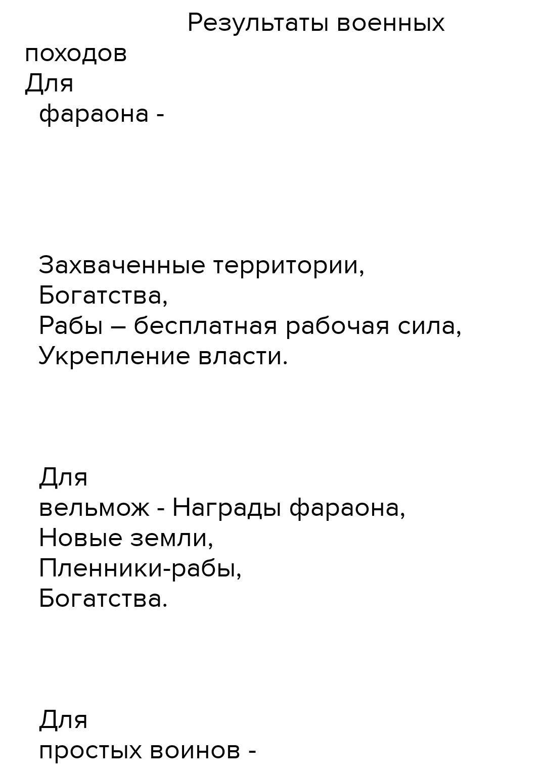 Опираясь на материал видеоконсультации к уроку или иные источники информации, напишите итоги завоевательных походов для фараона и вельможи и для простых воинов (не менее 3 в каждой группе).