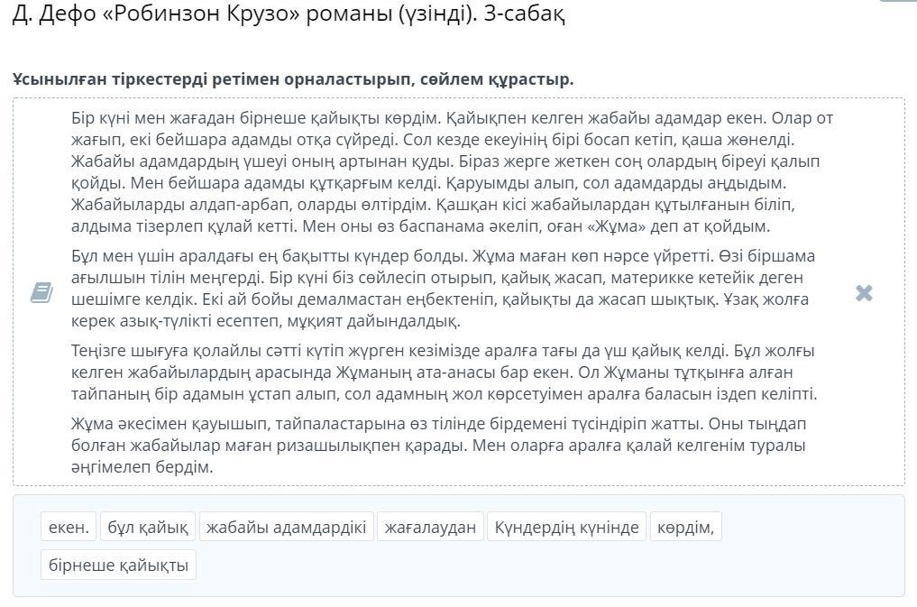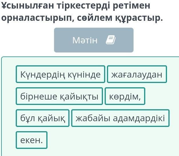 Ұсынылған тіркестерді ретімен орналастырып, сөйлем құрастыр.