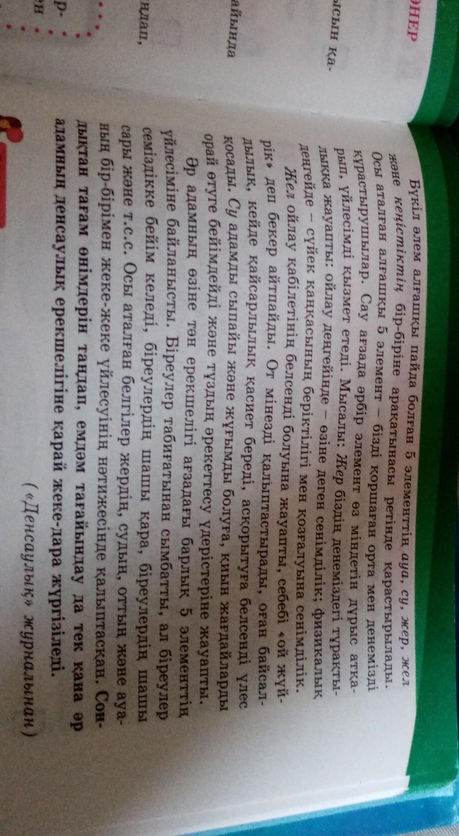 2)5 элеммент туралы:ауа,су,жер,жел,қорек.