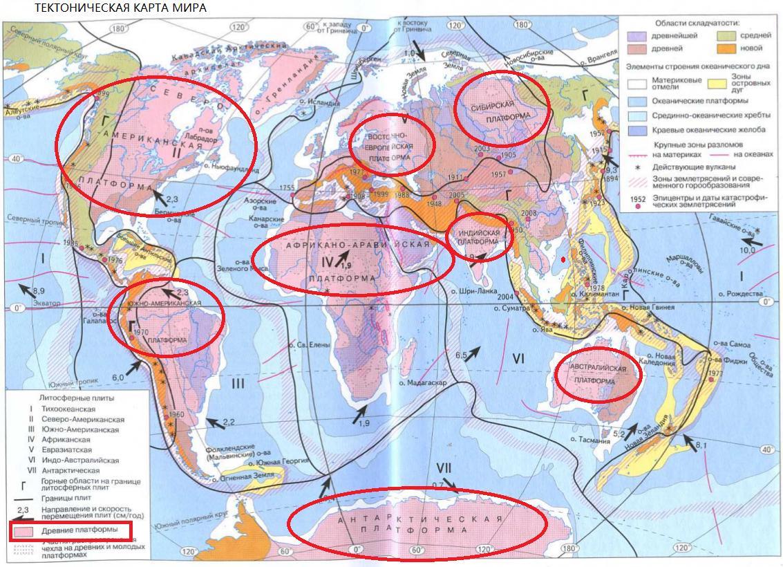 Если мы посмотрим на карту, которая дана ниже, то увидим, что древними платформами являются: