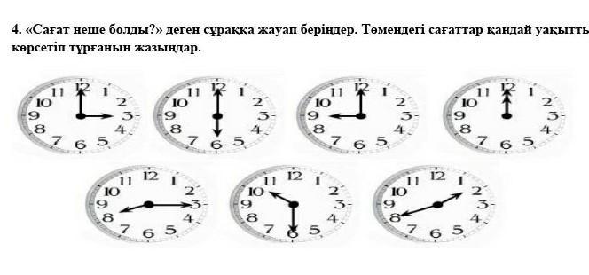 ПОМОГИТЕ ПОЖАЛУЙСТА СРОЧНО!!! Нужно на казахском языке *словами* написать какое время показано на часах.