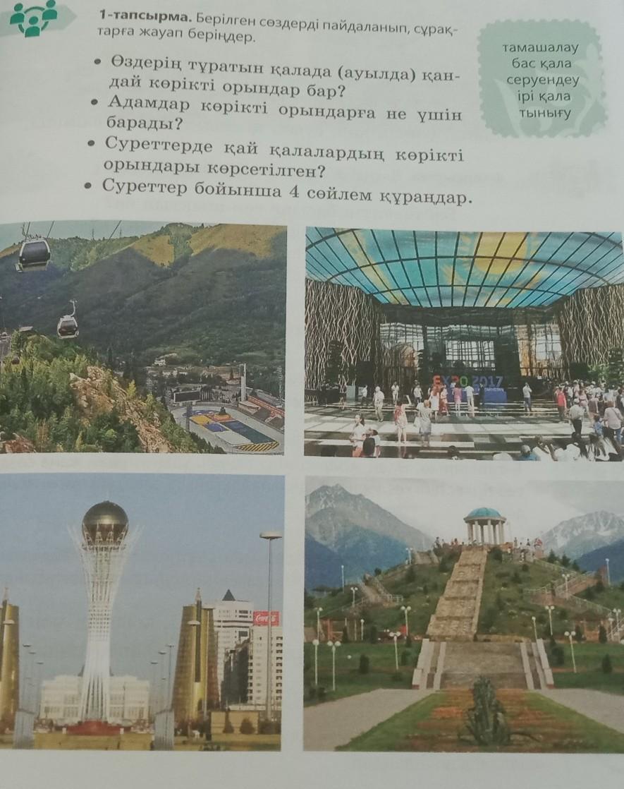 Мен Нұр-Сұлтан (Астана) қаласында тұрамын. Бас қаламызда көрікті орындар жетерлік: Астана Бәйтерек монументі, Бейбітшілік пен келісім сарайы, Хан Шатыр сауда орталығы, түрлі саябақтар мен театрлар т.б.