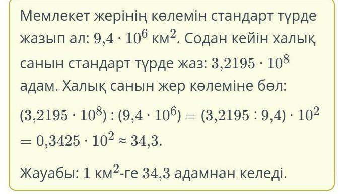 АҚШ-тың жер көлемі 9,4 млн км2. Ал халқының саны 321,95 млн адам болса, орналасу тығыздығын есепте. Жауабын ондық үлеске дейін жуықта. Пж