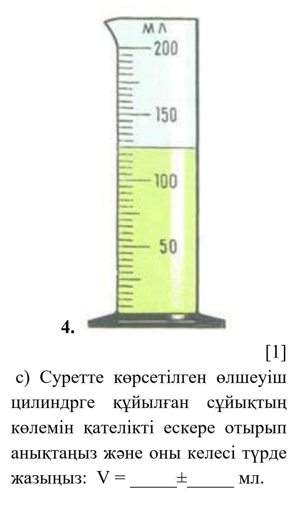 3) Объем жидкости в мензурке 100 мл и еще 5 делений.