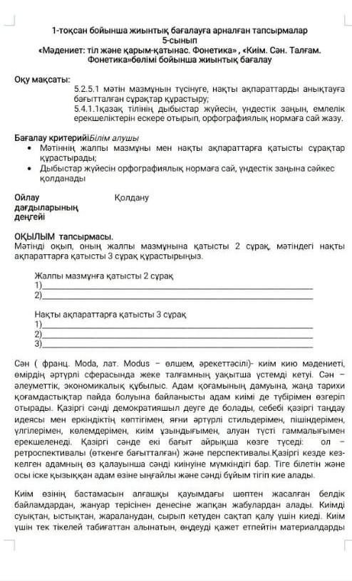 Мәтінді оқып, оның жалпы мазмұнына қатысты 2 сұрақ, мәтіндегі нақты ақпараттарға қатысты 3 сұрак кұрастырыңыз