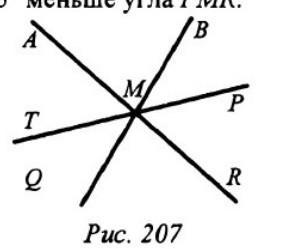 62. Три прямые пересекаются в одной точке М . Найдите угол АМВ, если он в 3 раза больше угла ТМО и на 5° меньше угла PMR.