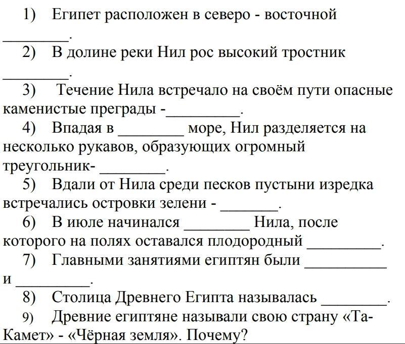 9) Нила казалось чёрным из за ила в нем. Страна придегающая к аравийской пустыне.