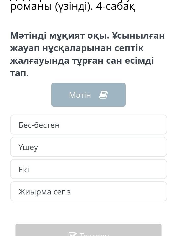 Мәтінді мұқият оқы. Ұсынылған жауап нұсқаларынан септік жалғауында тұрған сан есімді тап.
