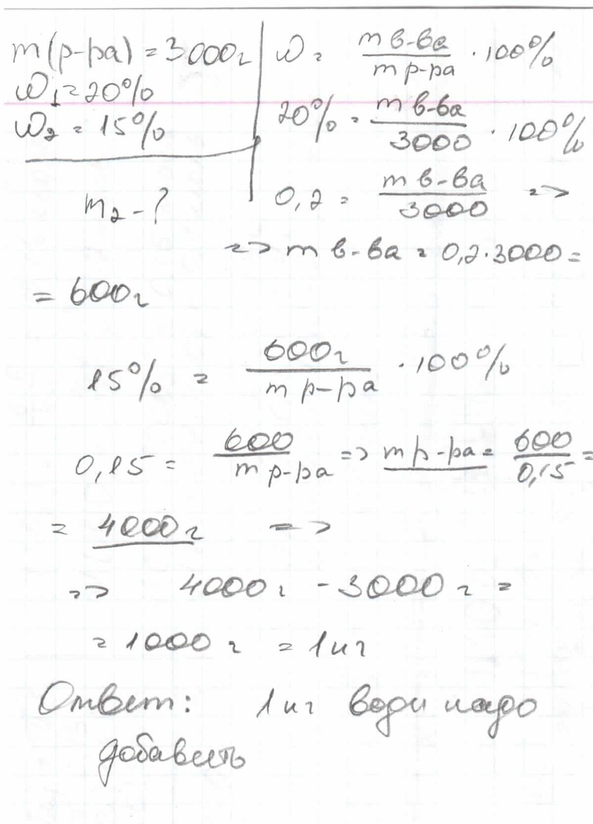Сколько воды надо прибавить к раствору массой 3 кг с массовой долей соли 20% для получения раствора с массовой долей 15% ?