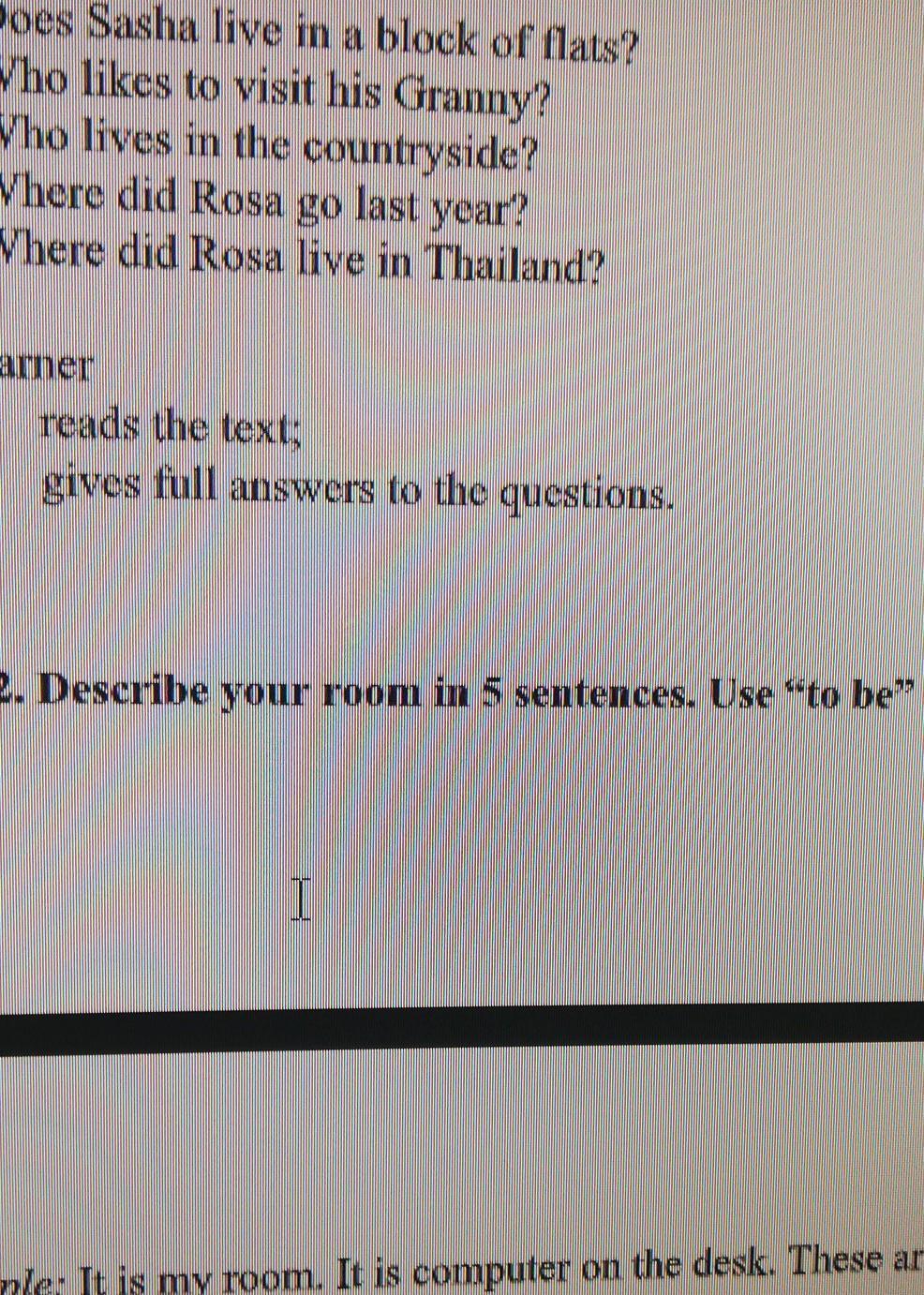 I have a big room. My room very beautiful. There is computer on the table, there are my dresses in my wardrobe. I do my homework in my room. I love my room.