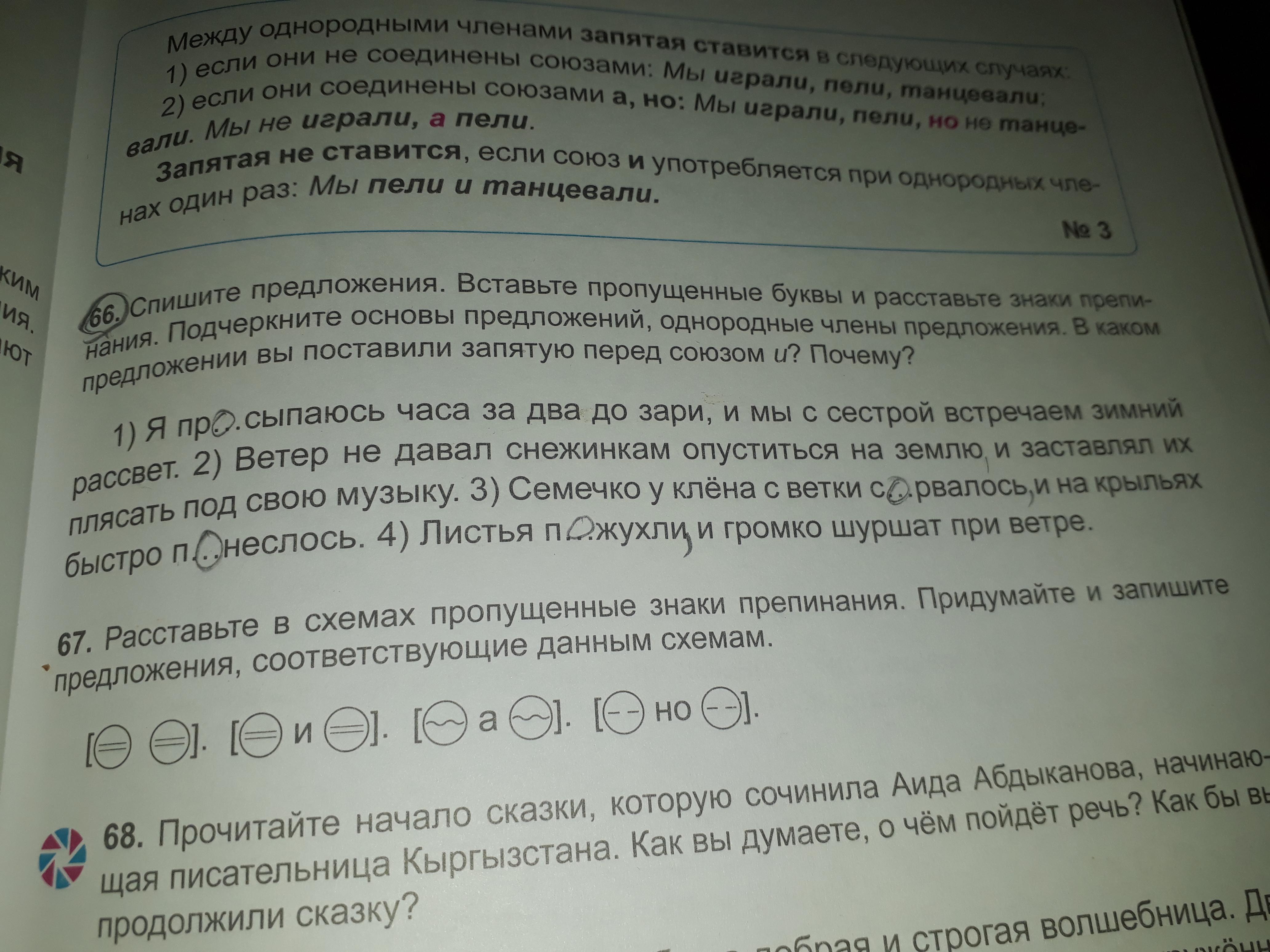 1) Я просыпаюсь часа за два до зари, и мы с сестрой встречаем зимний рассвет. 2) Ветер не давал снежинкам опуститься на землю , и заставлял их плясать под свою музыку. 3) Семечко у клёна с ветки сорвалось, и на крыльях быстро понеслось. 4) Листья пожухли , и громко шуршат при ветре.