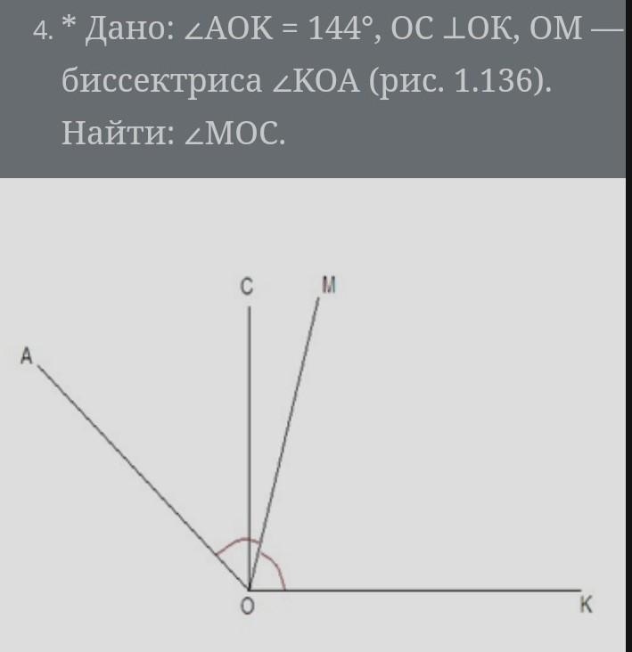 АОМ = ∠КОМ = ∠АОК/2 = 144°/2 = 72 так как ОМ биссектриса,