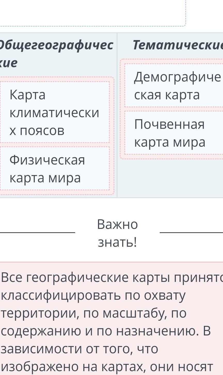 Распредели карты по содержанию на общегеографические и тематические, перемещая их в соответствующие колонки приведенной таблицы.