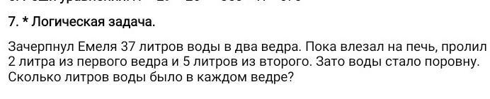 Там же написано стало поровну, после того как разлил 7 литров (в сумме 2+5) 17 и20 это у него было, но он разлил!! И стало поровну