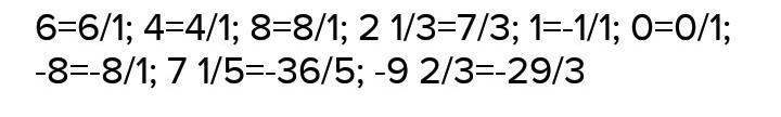 Представьте в виде отношения m\n (где m - целое число, а n - натуральное число) следующие числа: 6 ;4,8 ; 2 1\3; 1; 0; -8; -7 1\5; -9 2\3