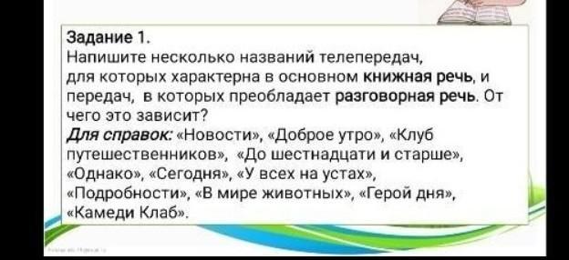 Книжная речь характерна для передач: "Новости","Сегодня","Подробности","Парламентский час","Клуб путешественников","Однако","Слушается дело","Зеркало","Гомеопатия и здоровье".