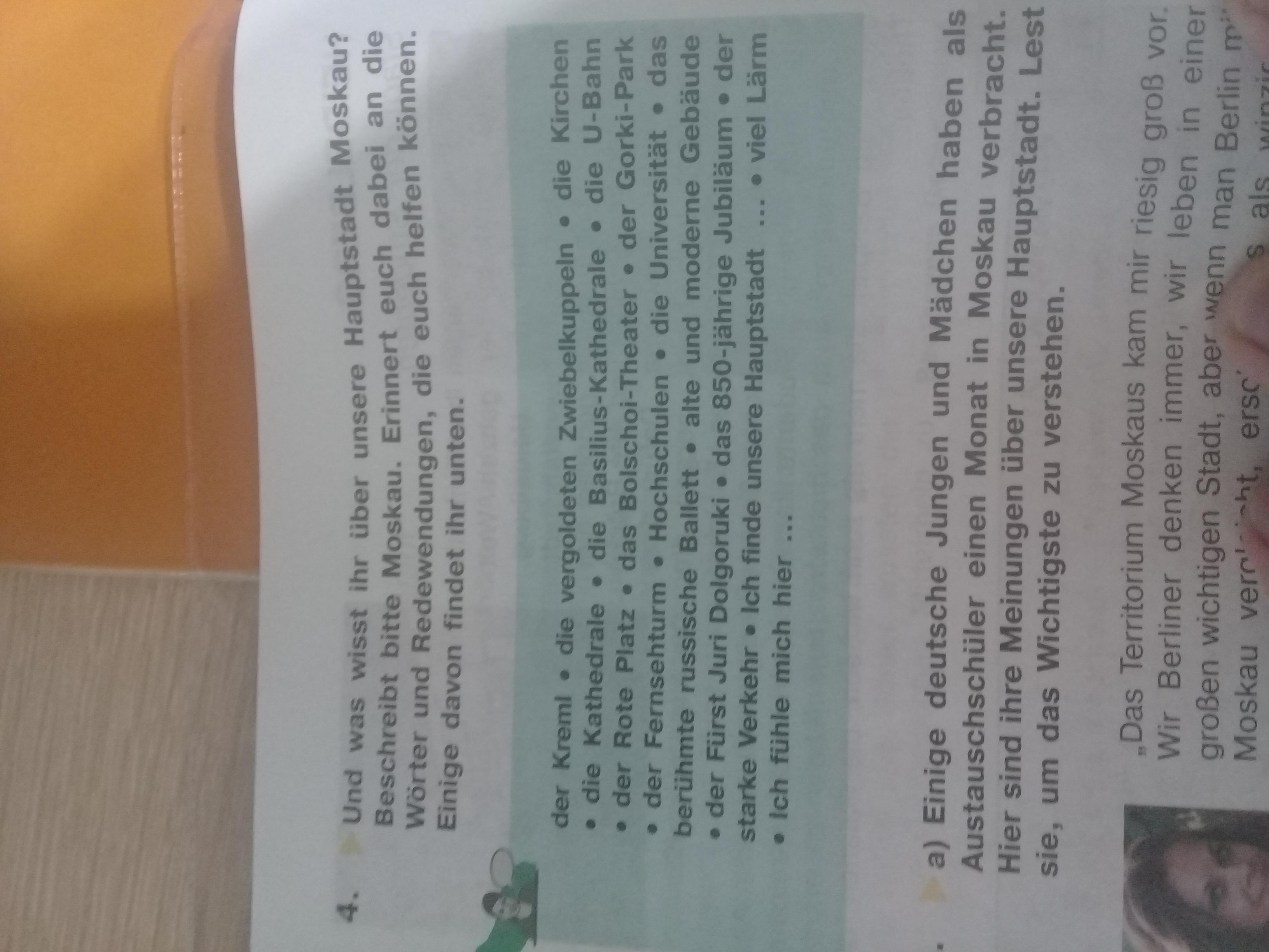 In Moskau gibt es viele Kirchen mit vergoldeten Zwiebelkuppeln und Kathedralen. Die Moskauer U-Bahn ist weltbekannt. Man kann sagen, dass die Stationen der U-Bahn wie unterirdische Paläste aussehen. Das Bolschoi - Theater ist das bekannteste Theater für Oper und Ballett in Russland. In der Nähe vom Bolshoi – Theater befindet sich auch das Maly – Theater.