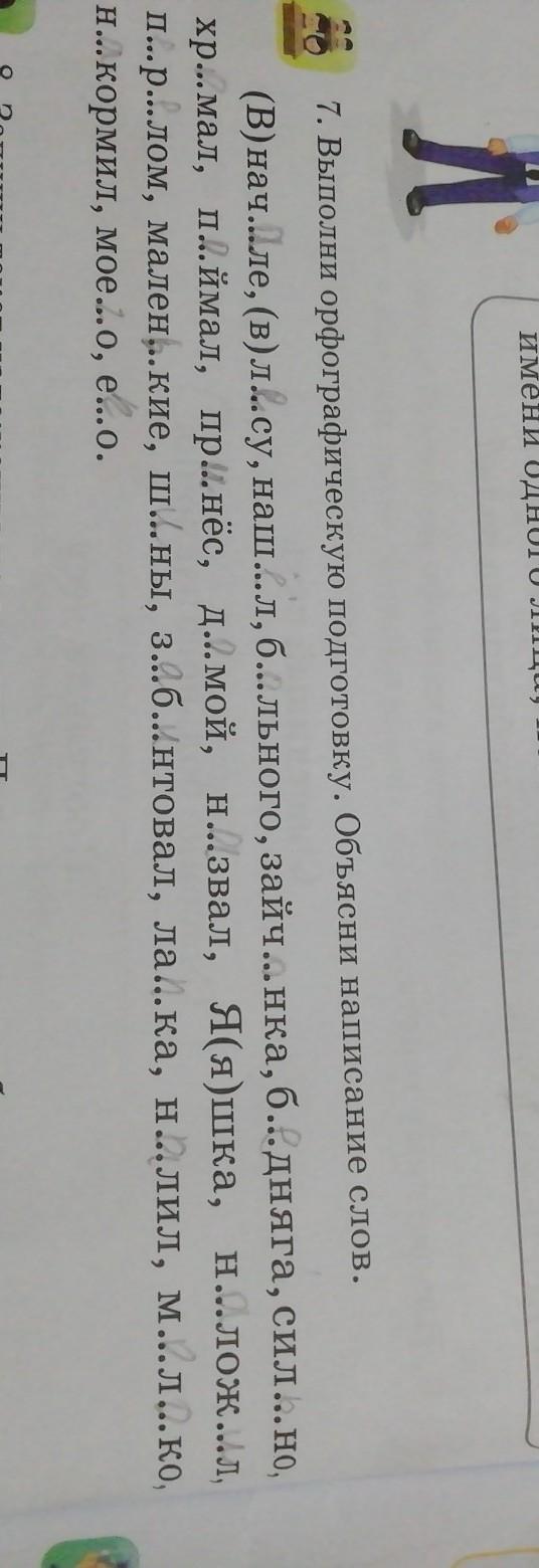 Вначале (наречие), в лесу́ (лес), нашёл (нашедший), больно́го (боль), зайчо́нка (суффикс -ОНК- под ударением О), бедня́га (бе́дный), сильно (Ь - показатель мягкости), хрома́л (хро́менький), пойма́л (по́йманный), принёс (приставки ПРИ- → доведение действия до конца), домо́й (дом), назва́л (на́званный), Яшка (имя собственное), наложил (приставка НА; жи/ши с И), перелом (приставка ПЕРЕ-), маленькие (Ь - показатель мягкости), шины (жи/ши с И), забинтова́л (приставка ЗА-; бинт), лапку (лапок), налил (приставка НА-), молоко́ (словарное слово; моло́чный), накормил (приставка НА-), моего, его.