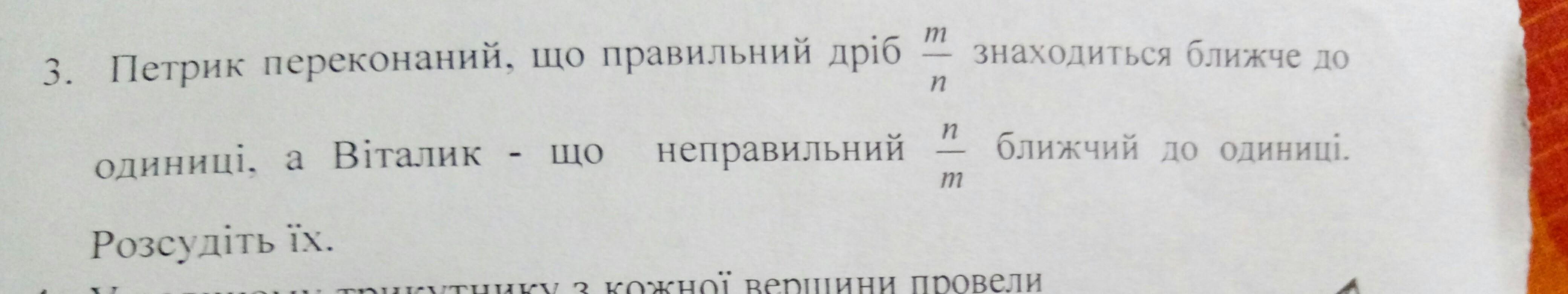 Поможіть терміново! Тут є картинка а якшо не працюж вона тримайте завдання так: Пертик переконаний, що правильний дріб знаходиться ближче до одиниці, а Віталик - що неправильний ближчий до одиниці розсудіть їх