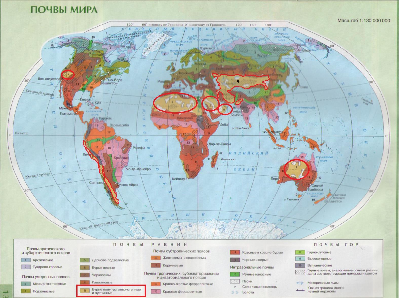 Если мы посмотрим на карту почв мира и карту природных зон суши, то увидим, что в полупустынях и пустынях бурые полупустынно-степные и пустынные почвы.