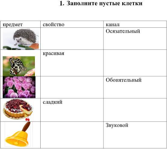 1. Заполните пустые клетки предмет свойство канал Осязательный красивая Обонятельный сладкий Звуковой
